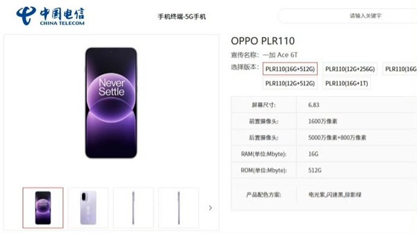 一加 Ace 6T 手機已現身中國電信終端產品庫,提供 12GB+256GB、12GB+512GB、16GB+256GB、16GB+512GB、16GB+1TB 五種存儲規格,擁有電光紫、閃速黑、掠影綠三種配色,產品零售價格尚未公布。
